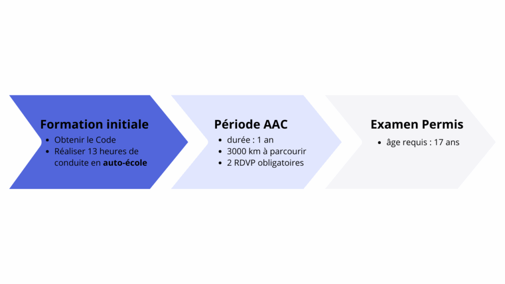 Tout commence par la formation théorique pour l’obtention du code de la route. Une fois le code en poche, l’élève suit sa formation pratique avec un moniteur diplômé. Un minimum légal de 13 heures de conduite est requis. À l’issue de cette étape, si le niveau est jugé suffisant et que l’apprenti est capable d’assurer sa sécurité, le moniteur délivre l’attestation de fin de formation initiale (AFFI), le sésame pour commencer à conduire avec l’accompagnateur.
